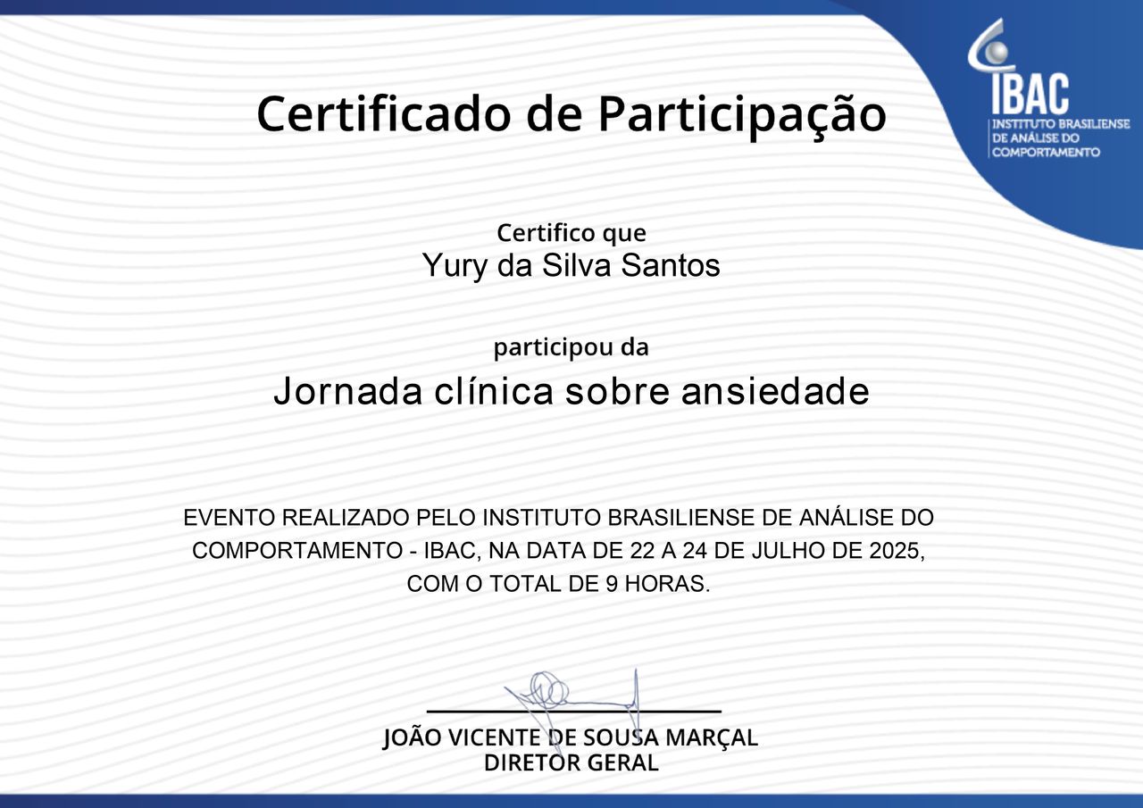 Olá, sou Yury, psicólogo clínico e especialista em Avaliação Psicológica. Minha atuação é fundamentada na Psicologia científica e guiada por um compromisso ético rigoroso, sempre respeitando a singularidade, a história e os limites de cada pessoa que busca atendimento.